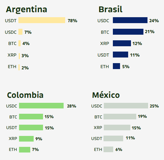 Por país, Argentina destaca con un 85% de compras en dólares digitales (USDT 78% y USDC 7%), Colombia y Brasil muestran un equilibrio entre stablecoins y BTC, y en México el liderazgo es de USDC (25%), seguido por Bitcoin (19%) y XRP (15%).