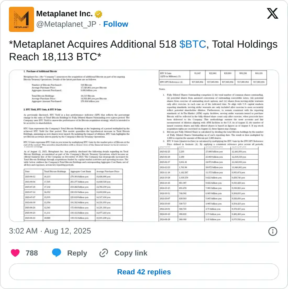 La firma de inversión japonesa Metaplanet anunció el martes que ha comprado 518 BTC adicionales, llevando sus tenencias totales a 18.113 BTC.