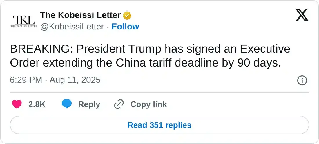 Aparte de esto, el mercado mostró un optimismo cauteloso tras la noticia de que la tregua arancelaria entre EE.UU. y China se extenderá hasta el 10 de noviembre, junto con el alivio temporal de China sobre ciertos controles de exportación a empresas estadounidenses durante 90 días.