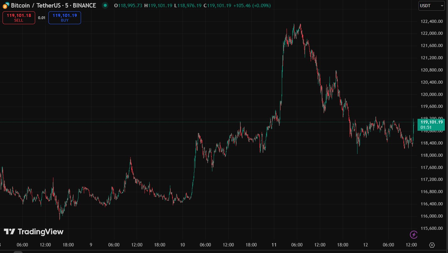 En efecto, el precio de bitcoin experimentó un incremento porcentual del 3,5% el lunes, para ubicarse a menos de 1.000 dólares de un nuevo récord, reportó CriptoNoticias. Sin embargo, la cotización corrigió luego y, al momento de escribir este reporte, BTC se negocia por encima de los USD 119.000, como se puede apreciar en esta gráfica de TradingView: