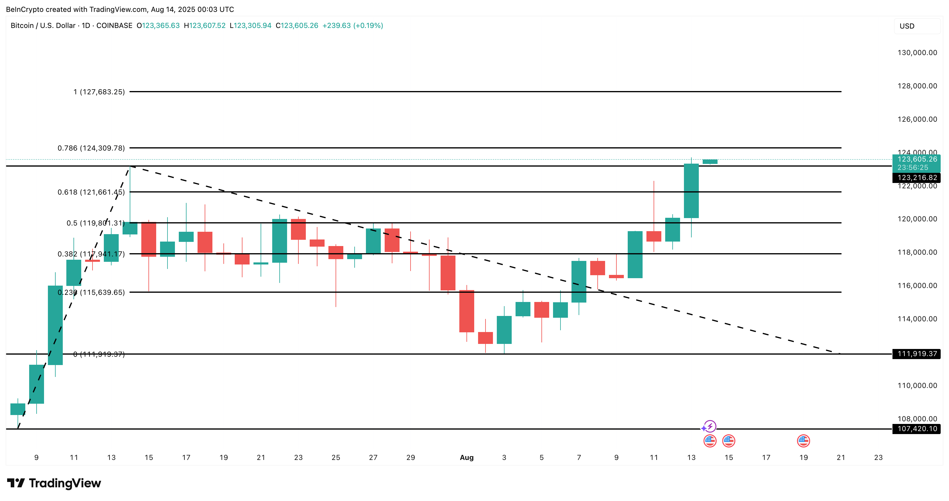 Con el momentum ahora inclinado fuertemente hacia los alcistas, la prueba inmediata se encuentra en 124,300 dólares, que se presenta como la última barrera significativa antes de que entren en juego objetivos más altos.