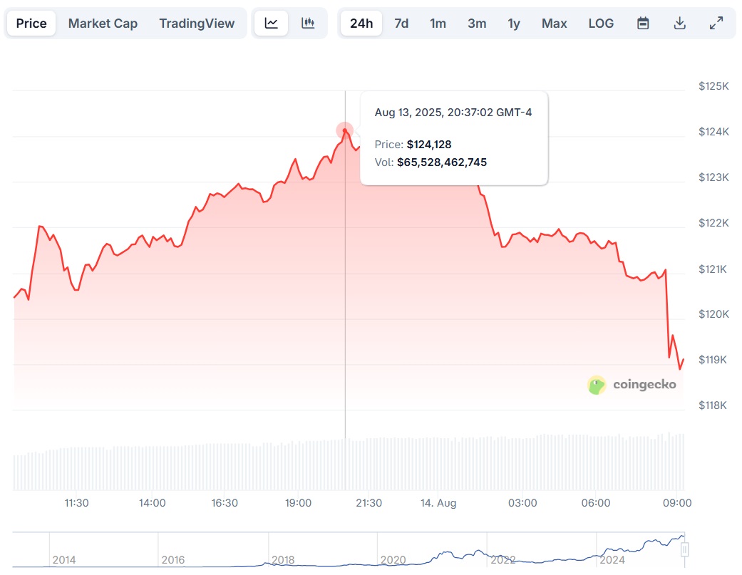Pero a pesar de los vientos favorables, Bitcoin está restando las últimas ganancias. Después de alcanzar un tope de USD $124.128 en los gráficos el miércoles en horas de la noche (ET), la criptomoneda insigne ahora ha disminuido un 4,3% hasta un precio actual de USD $118.620, según los datos de CoinGecko al momento de escribir estas líneas.