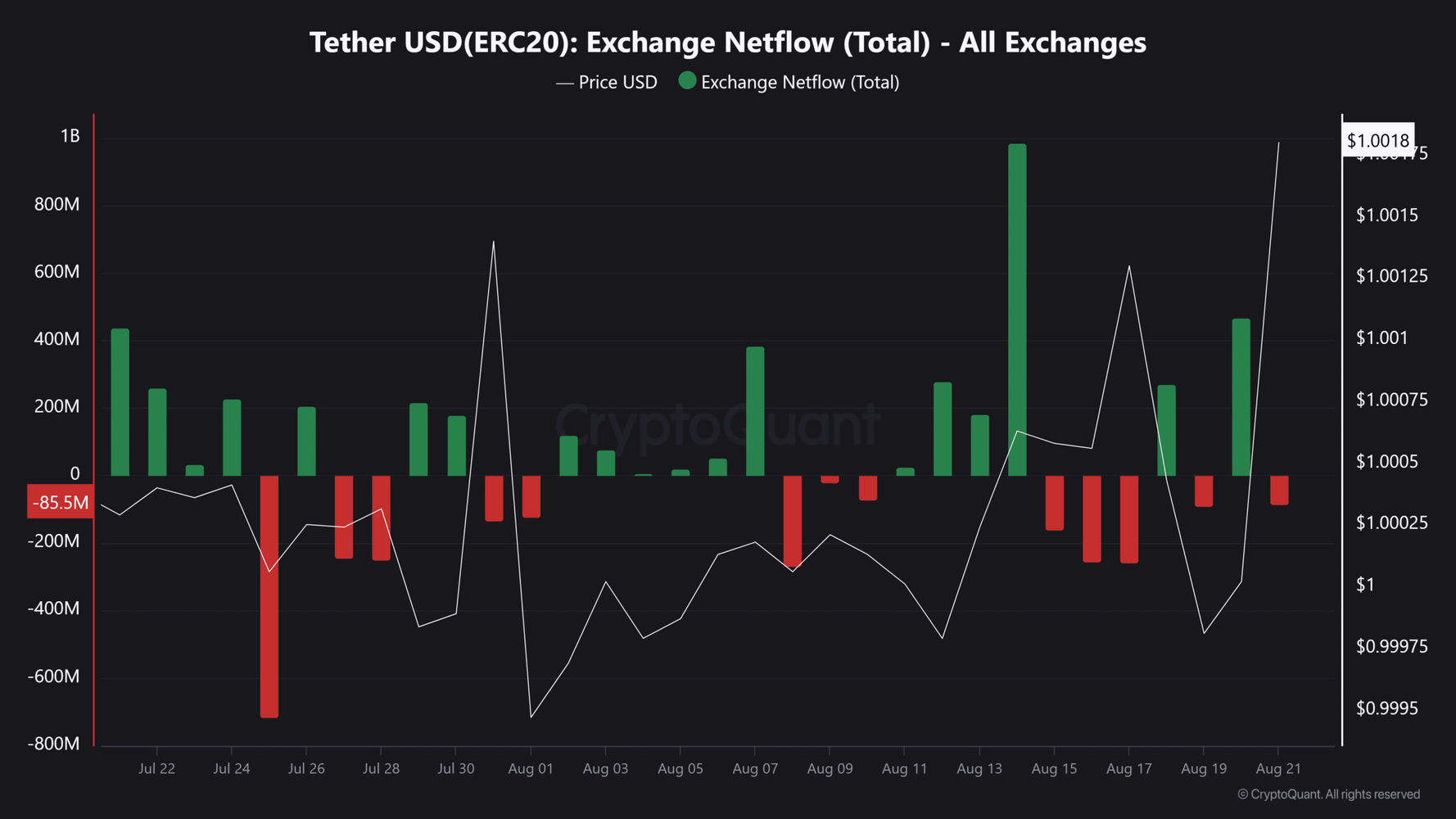 Mientras tanto, los flujos de USDT hacia las plataformas de intercambio se están intensificando, lo que prepara el terreno para un repunte similar al de mediados de junio, con 112.000 dólares como el punto óptimo para un retroceso hacia la formación de precios.