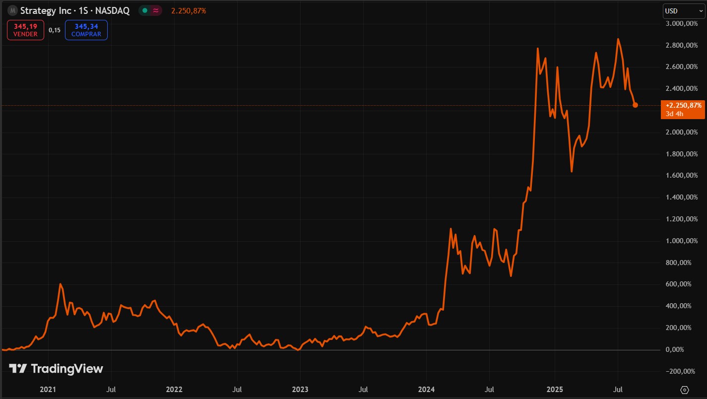 Por su masiva inversión, el valor de las acciones de Strategy, identificadas con el ticker MSTR en la bolsa de valores estadounidense, ha crecido de forma acelerada en los últimos cinco años, alcanzado un rendimiento de 2.250% en ese lapso, tal como se aprecia en el siguiente gráfico de TradingView.