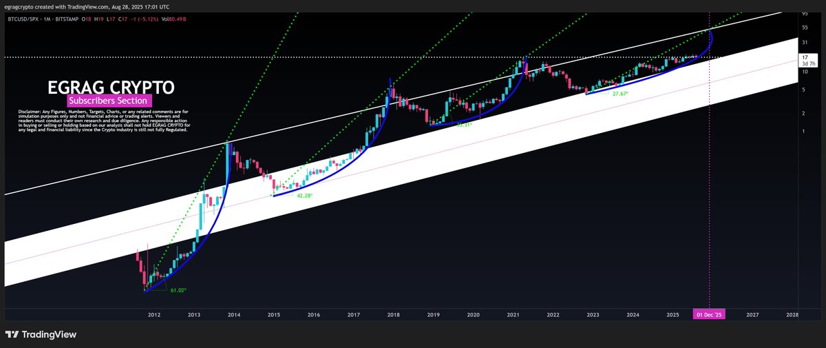 Egrag Crypto señaló que la desaceleración en el crecimiento indica una maduración del mercado. Según el analista, la reducción en la tasa de crecimiento significa un rally prolongado, no su conclusión. Los cálculos muestran una disminución promedio del 11.3% por ciclo, con una reducción total del 56% en el crecimiento, pero el gráfico de precios mantiene una tendencia alcista.
