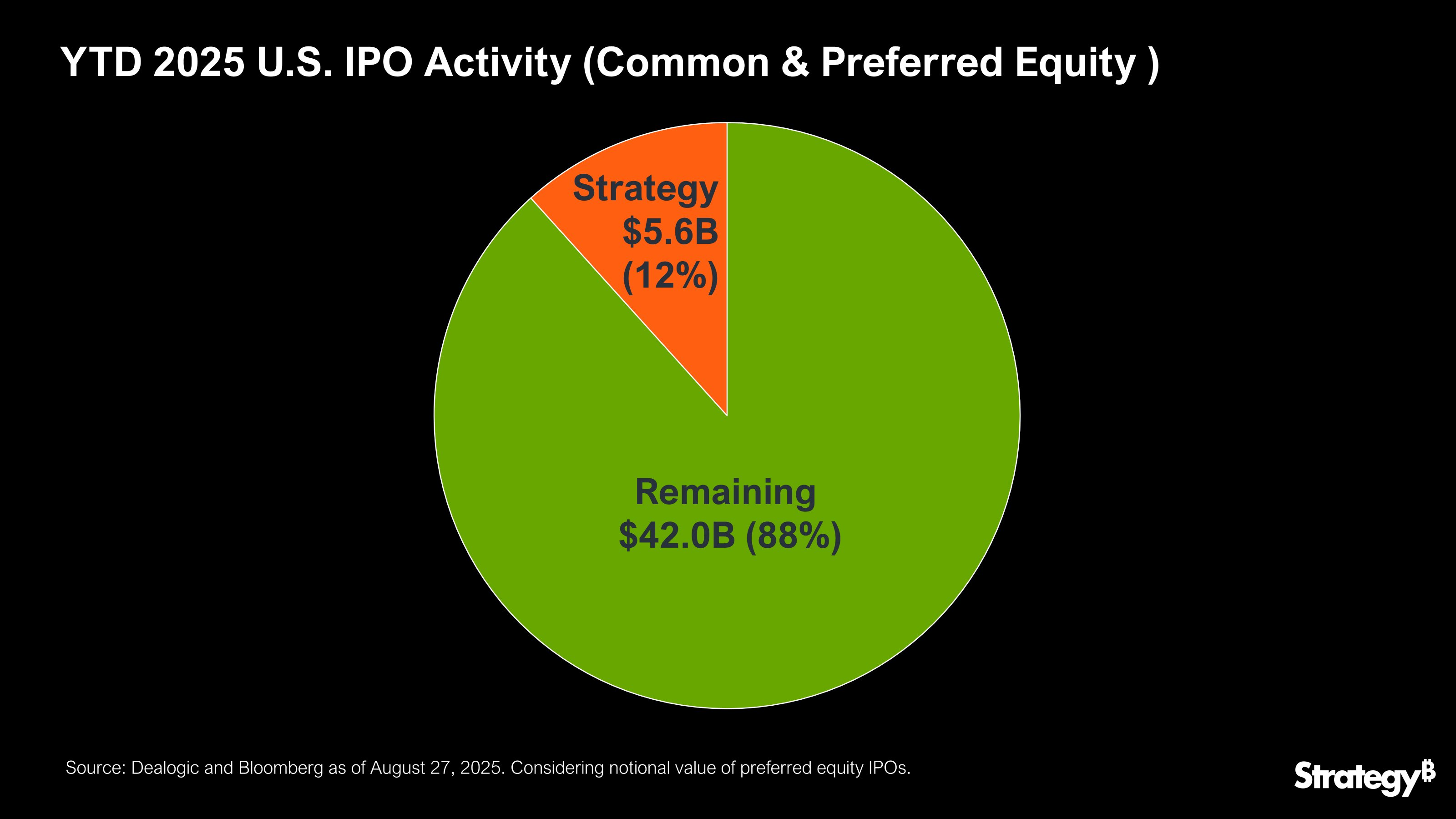 Strategy ha dependido en gran medida de los mercados de acciones para financiar sus compras. Hasta ahora en 2025, la empresa ha recaudado 5,6 mil millones de dólares en IPO. Esto representa alrededor del 12% de todos los listados en Estados Unidos.