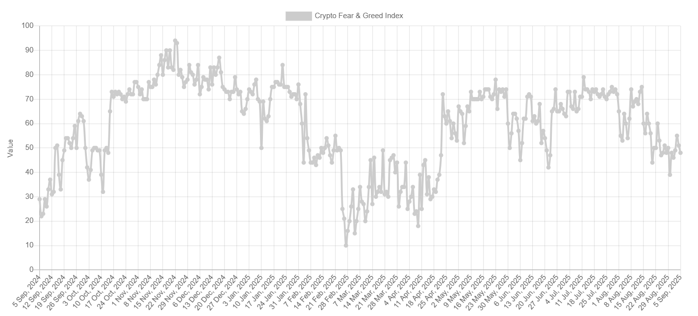 El índice de miedo y codicia de las criptomonedas, que mide el sentimiento general del mercado de criptomonedas, se ha recuperado a 48 esta semana, reflejando un sentimiento neutral y sugiriendo que la presión bajista puede estar disminuyendo.