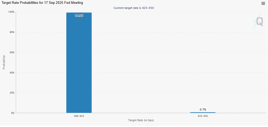 La herramienta FedWatch del CME Group, como se muestra en el gráfico a continuación, indica una posibilidad del 99,3% de un recorte de 25 puntos básicos (pbs) por parte del banco central en la reunión de septiembre. Las expectativas de recorte de tasas de la Fed podrían pesar sobre el Dólar estadounidense (USD) y aumentar el apetito por el riesgo, apoyando una recuperación en activos más arriesgados, como BTC. Además, los participantes del mercado esperan que el banco central realice al menos dos recortes de tasas para finales de 2025, lo que podría impulsar aún más los precios de activos más arriesgados como BTC.