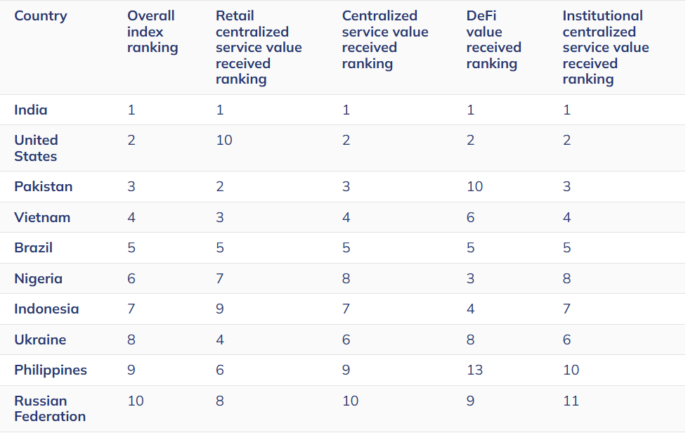 El informe señala además que países como India, EE.UU. y Pakistán se encuentran entre los tres primeros, seguidos de Vietnam y Brasil, lo que indica que estos países tienen una creciente adopción de cripto.