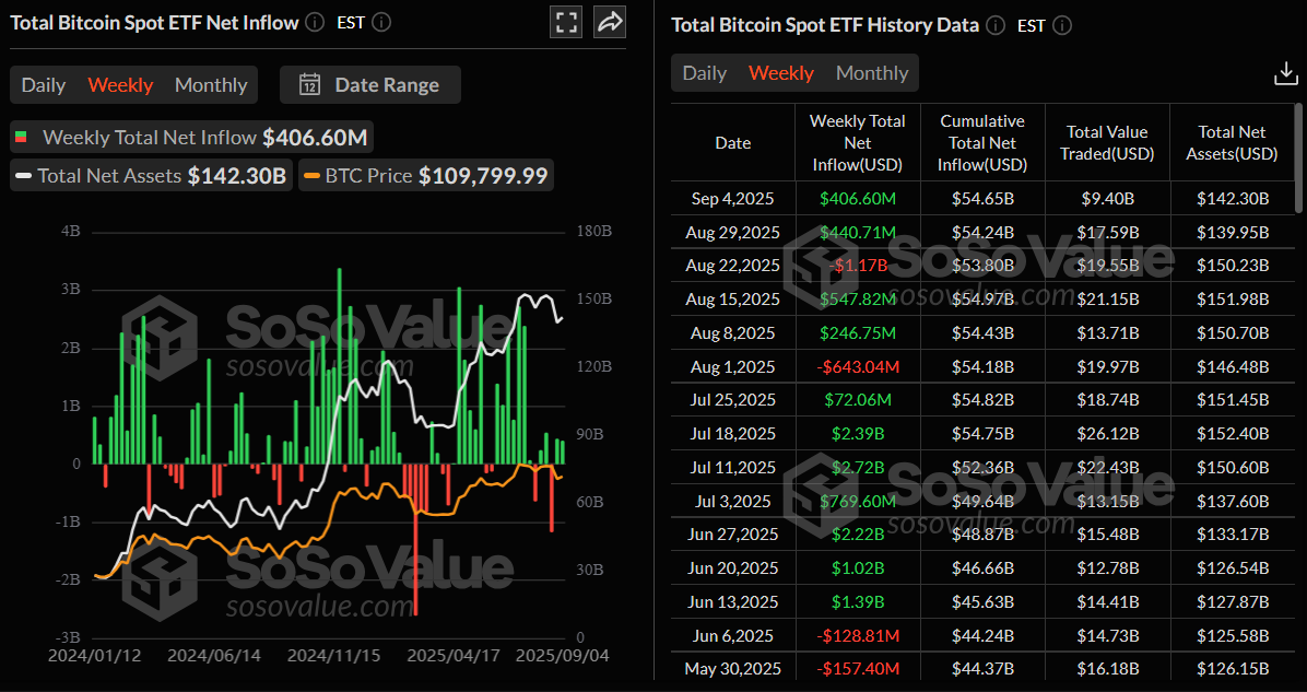 La recuperación del precio de Bitcoin ha sido respaldada por inversores institucionales y corporativos hasta ahora esta semana. Los datos de SoSoValue a continuación muestran que los fondos cotizados en bolsa (ETFs) de Bitcoin al contado registraron un total de 406,60 millones de dólares en entradas hasta ahora esta semana hasta el jueves, continuando su segunda semana consecutiva de flujos positivos. Sin embargo, estas entradas semanales son más pequeñas en comparación con las vistas a mediados de julio, cuando BTC se disparó hacia la marca de 120.000$ por primera vez.