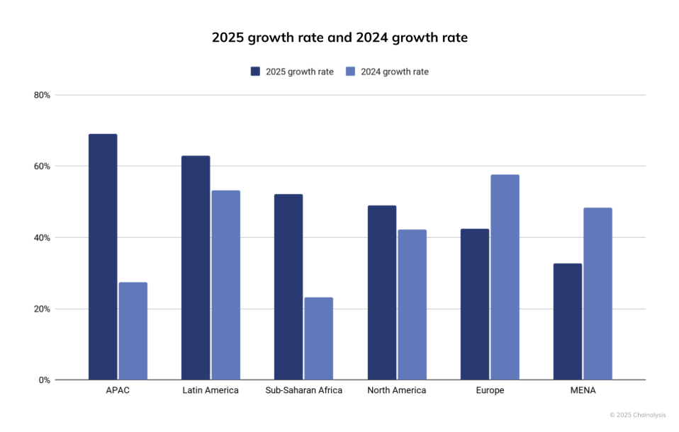 La región de Asia-Pacífico (APAC) lideró con un crecimiento interanual del 69% en transacciones cripto en cadena, impulsado principalmente por India, Vietnam y Pakistán, mientras que América Latina siguió con un crecimiento del 63%.