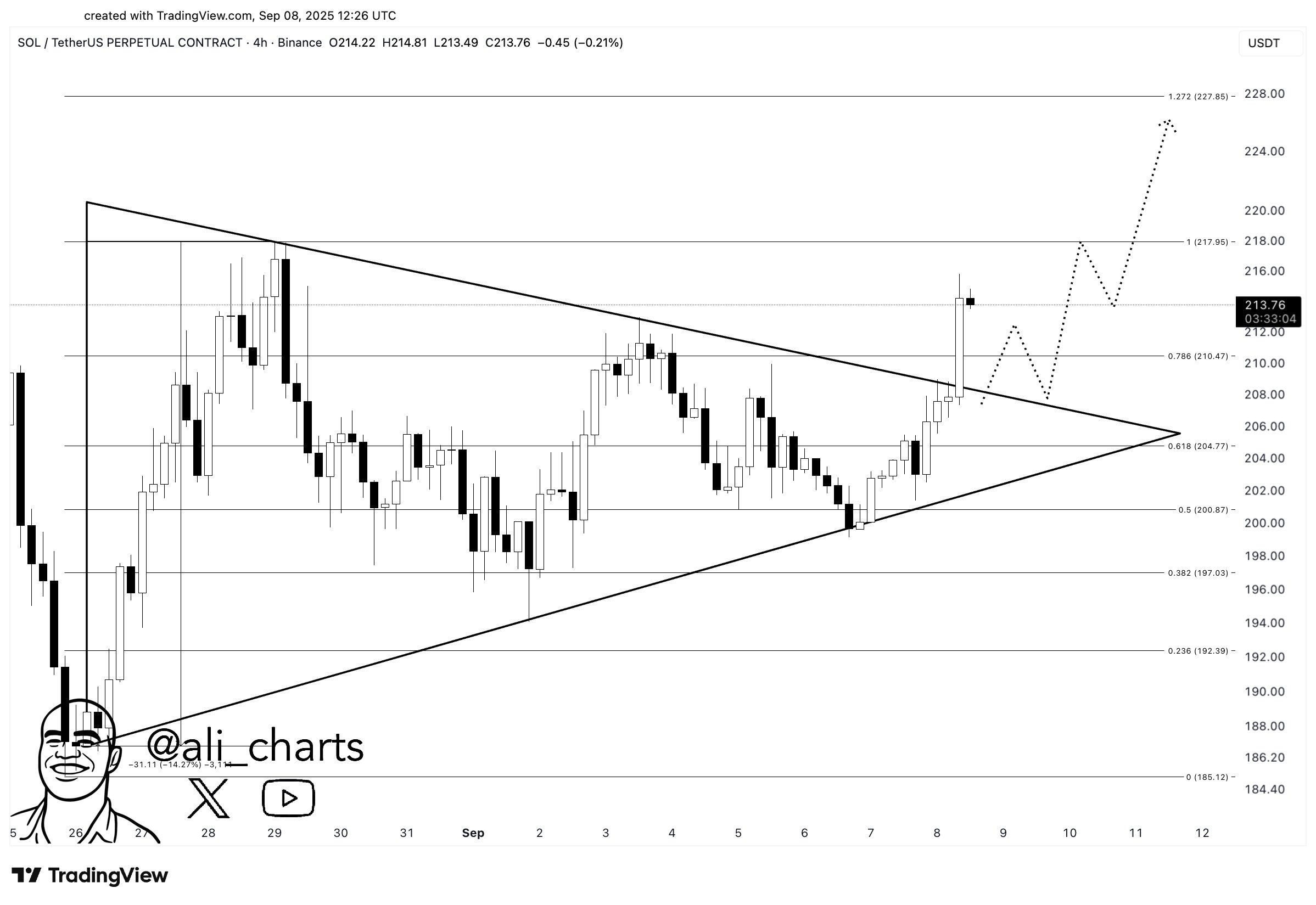 Veamos las expectativas a corto plazo. El analista Ali Martinez sugiere un quiebre para la moneda SOL. El precio podría probar nuevamente el nivel de $210 o dirigirse directamente a $228. Cerrando por encima del soporte de $228, que sirvió como base antes del ATH de $260, podría impulsar el interés de los inversores, especialmente para los activos del ecosistema de Solana.