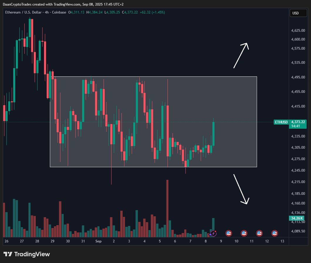 “ETH ha estado comerciando en un rango estrecho durante aproximadamente dos semanas. Recomiendo esperar hasta que veamos cierres por encima de $4,500 o por debajo de $4,200 para determinar el movimiento a corto plazo. Hasta entonces, es solo volatilidad diseñada para capturar los fondos de los inversores impacientes.”