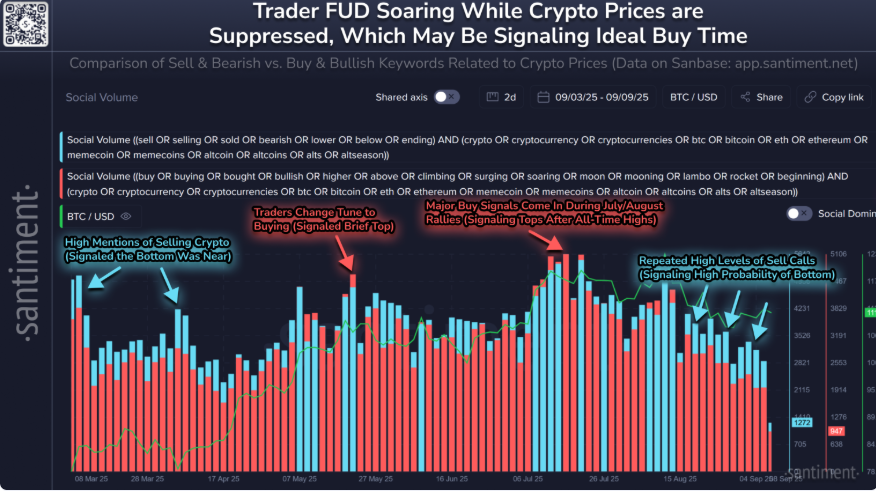 Los datos de Santiment a continuación muestran que el miedo, la incertidumbre y la duda (FUD) de los operadores se disparan mientras los precios de las criptomonedas están reprimidos, con expectativas de que el Bitcoin caiga por debajo de 100.000$, el Ethereum por debajo de 3.500$ y las altcoins atraviesen un período de retroceso. Históricamente, el precio se ha movido en la dirección opuesta a las expectativas de la multitud, destacando la condición actual como una alta probabilidad de un mínimo.