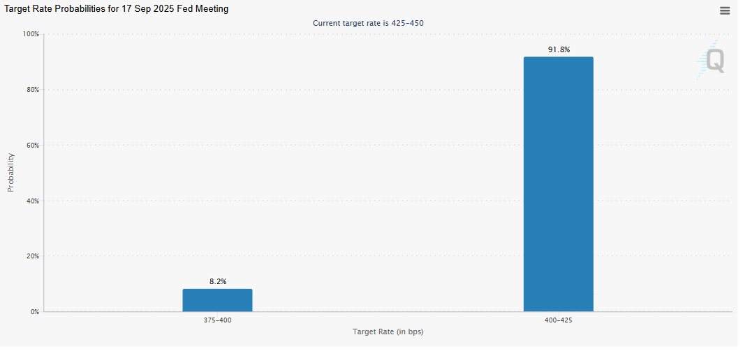 La herramienta FedWatch del CME Group muestra, además de una posibilidad del 91.8% de un recorte de 25 puntos básicos (pb) por parte del banco central de EE.UU. en la reunión de septiembre, una pequeña posibilidad de un recorte jumbo de 50 pb. Las expectativas de recortes de tasas de la Fed podrían pesar sobre el Dólar estadounidense (USD) y aumentar el sentimiento de riesgo, apoyando una recuperación en activos más arriesgados, como el BTC.