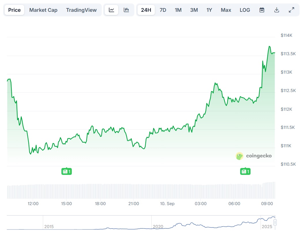 Bitcoin rebota sobre los USD $113.000 a medida que la lectura del IPP desafía las expectativas y alivia presiones. El mercado está atento a los datos económicos de EE. UU., a la expectativa de un recorte de tasas la próxima semana.