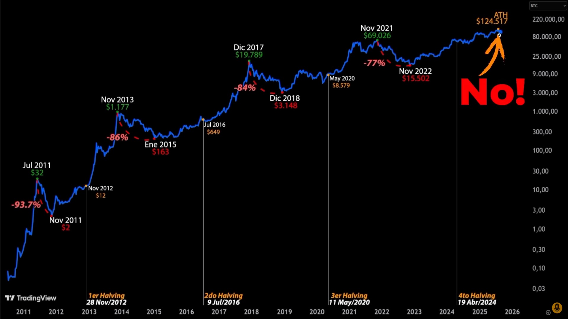 Para reforzar esa idea, compara datos históricos que muestran que, tras el máximo de 1.163 dólares en 2013, el precio cayó un 67% en cuatro semanas. En 2017, el retroceso fue de 20.000 a 11.160 dólares, una pérdida del 43% en el mismo periodo. Y en 2021, bitcoin pasó de 69.000 a 41.968 dólares, una corrección del 39%.