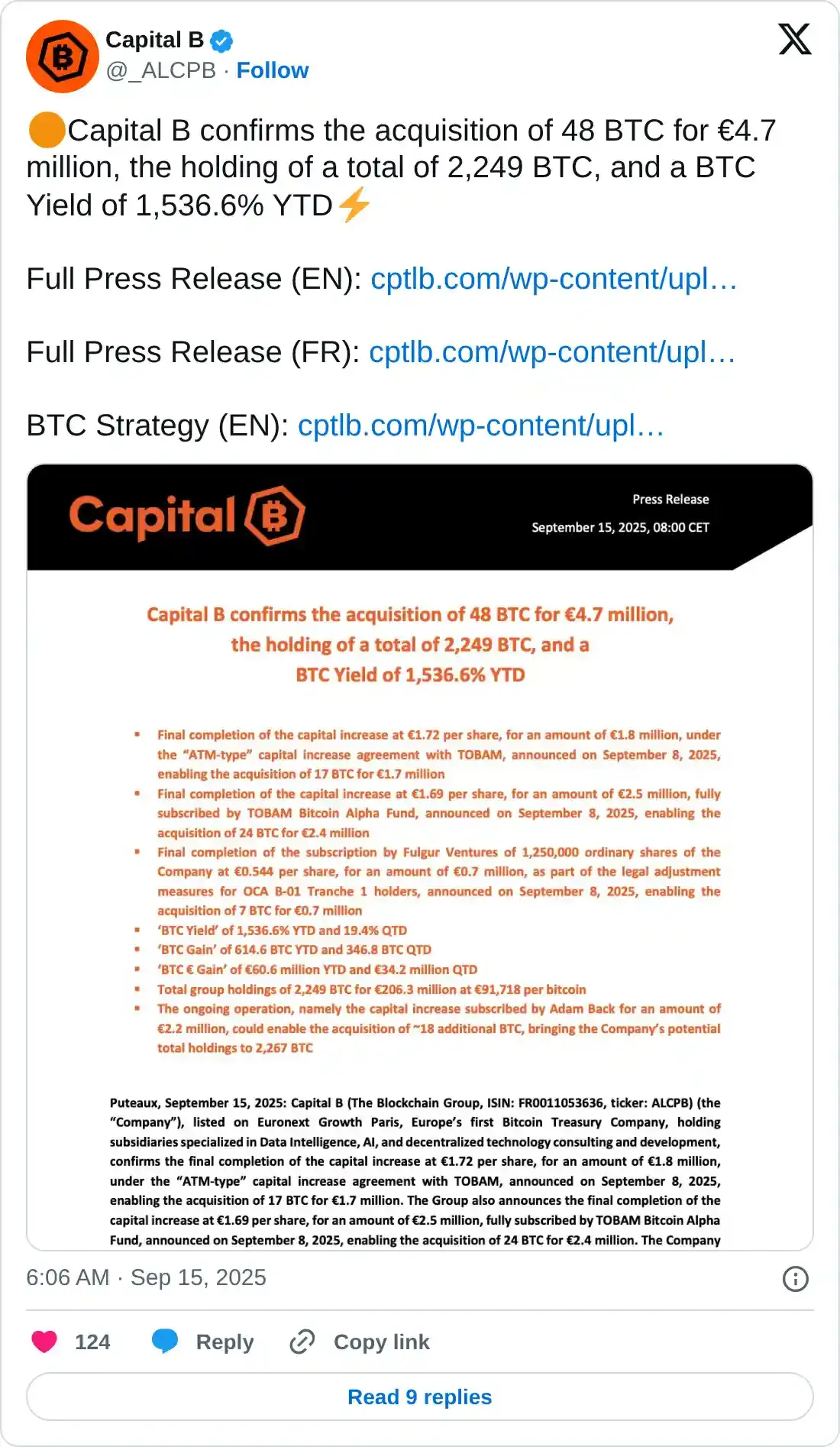 Aparte de las fuertes entradas institucionales, la demanda corporativa de BTC también se mantuvo fuerte. Capital B anunció el lunes que la empresa ha añadido 48 BTC, llevando el total de tenencias a 2.249 BTC. Durante el mismo período, BitcoinTreasuries.NET datos mostraron que la empresa de salud que cotiza en bolsa Prenetics añadió 40.6 BTC y anunció un plan para acumular 1 BTC diario; la empresa actualmente tiene un total de 228 BTC.