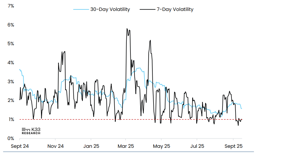 El gráfico de volatilidad a continuación indica que la acción del precio actual del Bitcoin se mantiene en una fase 'dócil', con una volatilidad de 7 días alcanzando mínimos anuales por debajo del 0.7% el martes pasado antes de aumentar ligeramente a medida que el BTC superó los 115.000$.