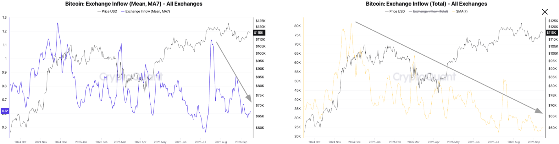 La presión de venta del Bitcoin se mantiene en niveles bajos antes de la decisión de tasas de interés de la Fed, ya que los grandes depósitos en los intercambios disminuyen. El gráfico a continuación muestra que el total de Bitcoin fluyendo hacia los intercambios ha disminuido a un promedio móvil de 7 días de 25.000 BTC, uno de los niveles más bajos en más de un año, y una caída significativa desde los 51.000 BTC del 17 de julio, cuando el Bitcoin cotizaba alrededor de 120.000$ por primera vez.