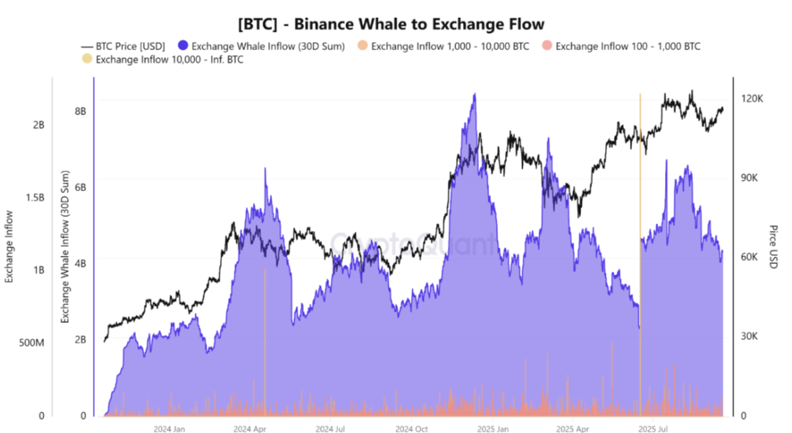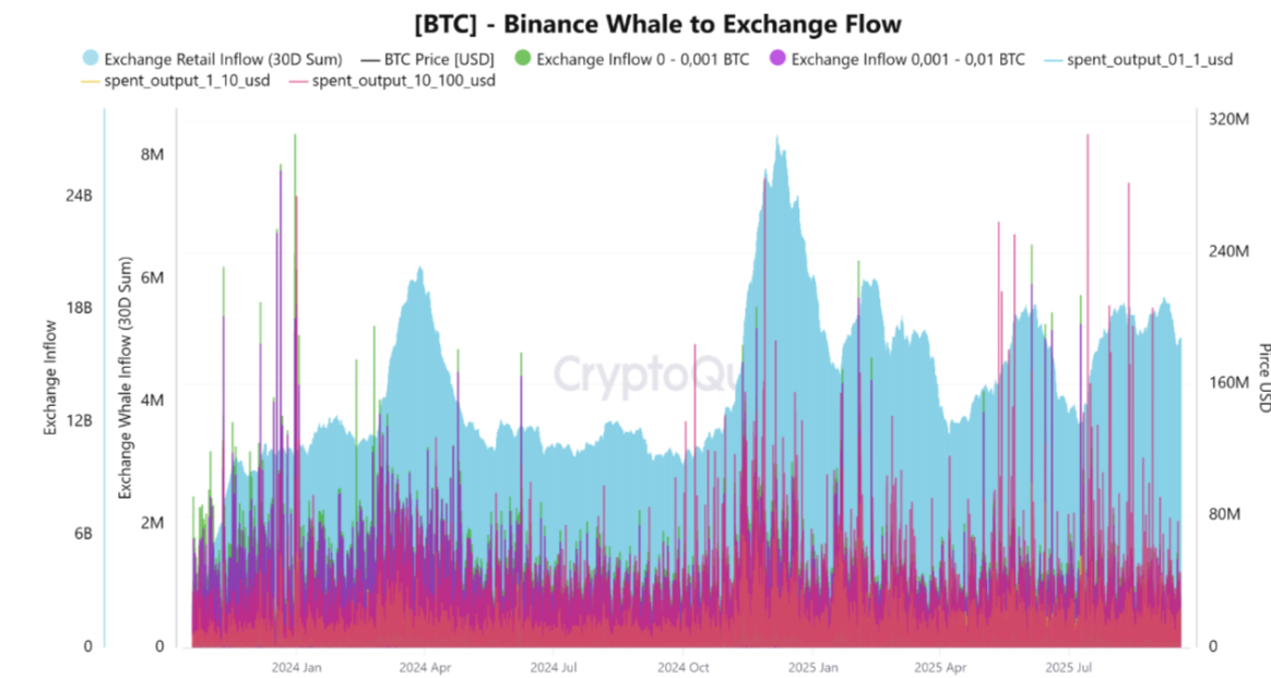 Los datos de CryptoQuant indican que el comercio de Bitcoin en el mayor intercambio, Binance, revela la ausencia de grandes entradas de ballenas, sugiriendo que el mercado está actualmente impulsado más por individuos que por grandes billeteras.