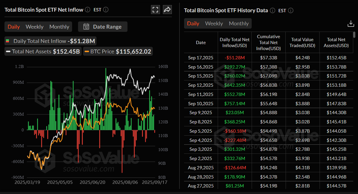 Los datos de SoSoValue muestran que los Fondos Cotizados en Bolsa (ETFs) de Bitcoin registraron una leve salida de 51.28 millones de dólares el miércoles, rompiendo la racha de entradas desde el 8 de septiembre.