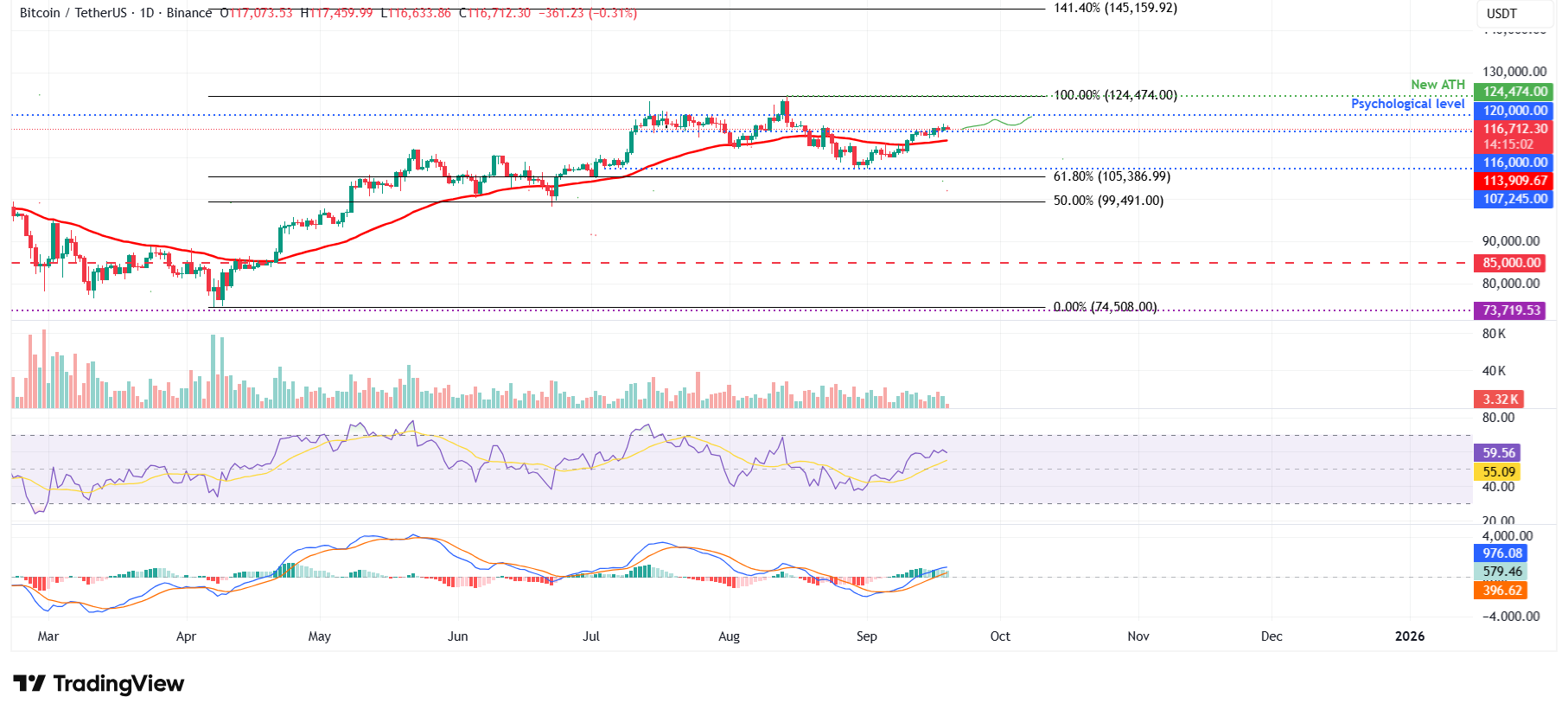 En el gráfico diario, el precio de Bitcoin rompió por encima de la media móvil exponencial (EMA) de 50 días el 10 de septiembre y subió un 2.43% durante los siguientes seis días, cerrando por encima del nivel de resistencia de 116.000$ el martes antes de enfrentar un ligero rechazo el miércoles. En el momento de escribir el viernes, BTC cotiza alrededor de 116.700$.