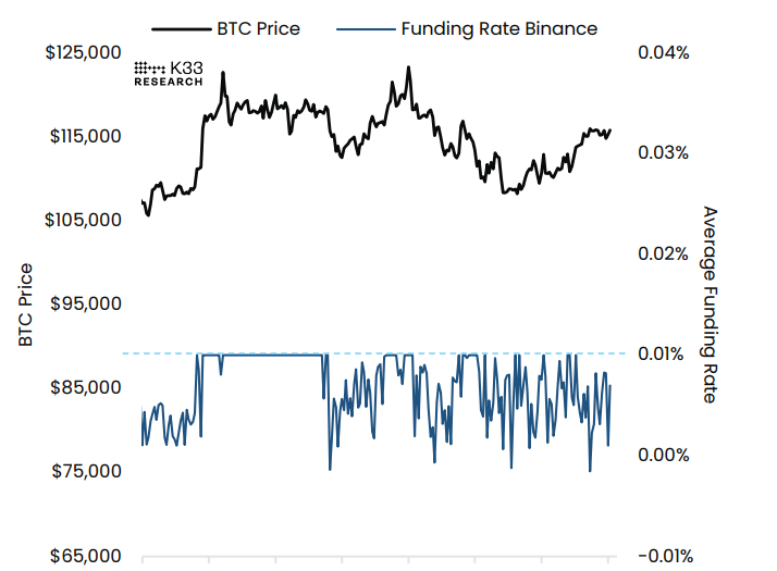 Además, el mercado sigue indeciso, según un informe de K33 publicado esta semana. Las tasas de financiación mantienen un patrón errático, oscilando por debajo de los niveles neutrales mientras los traders permanecen reacios a añadir exposición larga.