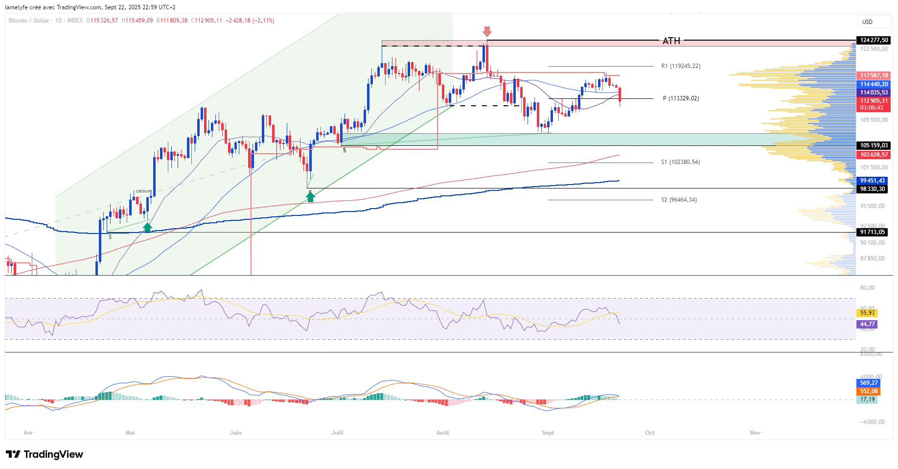 El mercado sigue delimitado por zonas precisas. Las resistencias están en 118 000 $ y luego en el ATH de 124 277 $, que representan umbrales críticos de distribución. A la baja, la zona 107 286 $ – 105 159 $ constituye un soporte principal. La ruptura diaria de los 112 000 $, seguida de un rebote, reforzó este nivel como referencia técnica.