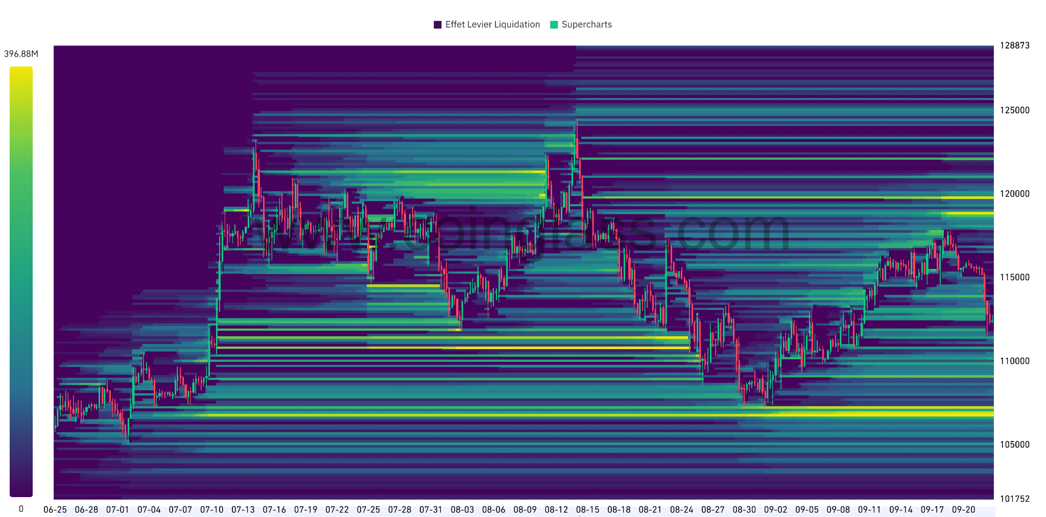 La zona de liquidación vendedora comprendida entre 118 000 $ y 120 000 $ aparece como un umbral crítico: un cruce podría reforzar la dinámica alcista, pero también podría servir como zona de distribución si el mercado pierde vigor. En sentido opuesto, la zona compradora entre 107 200 $ y 106 600 $ sigue vulnerable a una ruptura, susceptible de provocar una aceleración bajista, representando a la vez un punto de interés potencial para una acumulación estratégica.