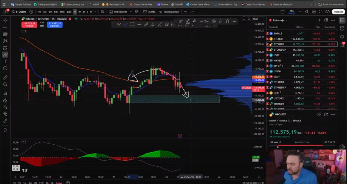 Merino confirmó que Bitcoin mantiene una estructura lateral en el gráfico diario, con zonas de compra establecidas alrededor de los $112.000. El analista enfatizó que el movimiento actual corresponde a un rango operativo donde los traders experimentados pueden capitalizar los movimientos laterales del precio.