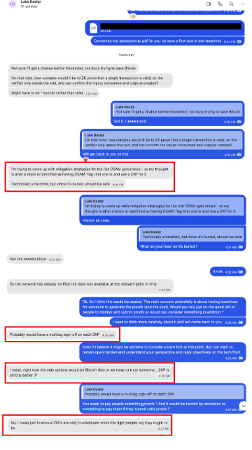El 25 de septiembre un medio difundió unos presuntos mensajes privados de Luke Dashjr, mantenedor de Bitcoin Knots y del pool OCEAN, en los que el desarrollador manifestó estar «considerando una bifurcación dura para implementar un comité multisig de confianza que pueda alterar retrospectivamente la blockchain para eliminar contenido ilícito».
