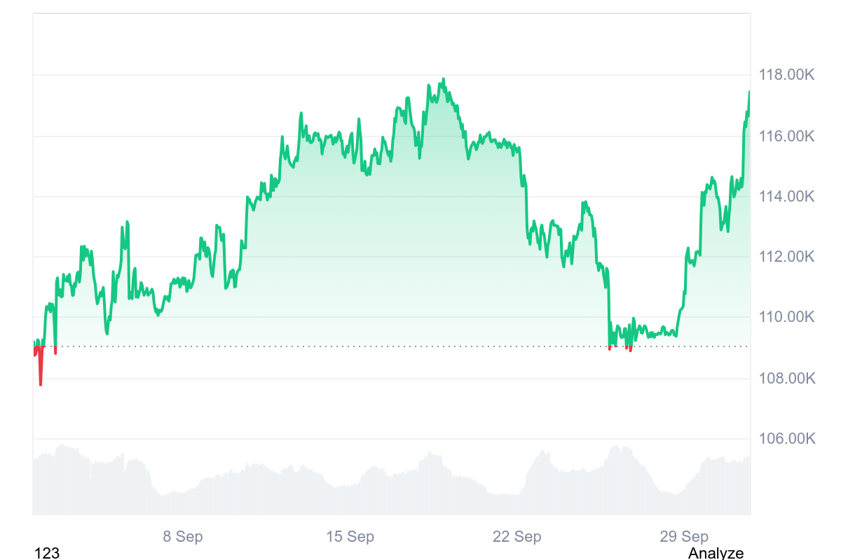 El precio de Bitcoin subió más del 3% cuando el gobierno federal de los Estados Unidos entró en un cierre parcial el miércoles, con BTC superando los USD 117,000 por primera vez en semanas.