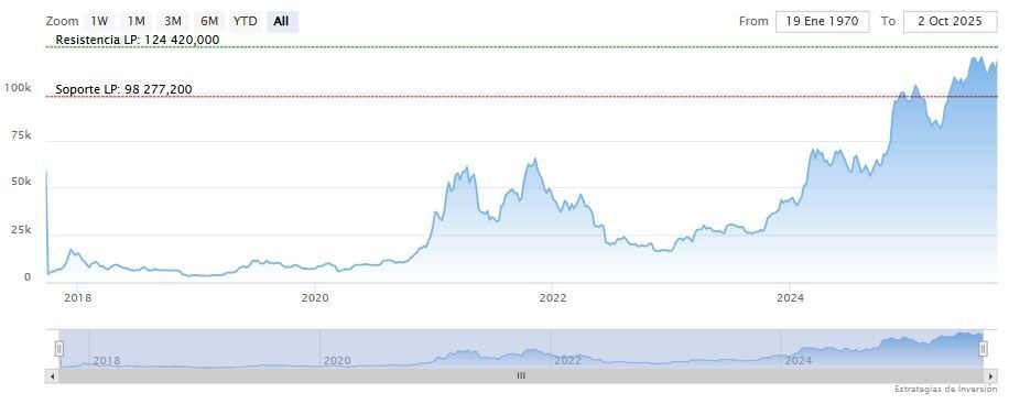 La resistencia a mediano y largo plazo se encuentra en los 124.420 dólares. Mientras, los indicadores de Ei se muestran en su mayoría alcistas.