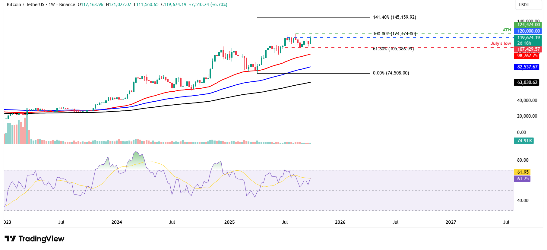 Si el BTC cierra por encima de 120.000$ de manera semanal, podría extender la recuperación hacia el máximo histórico de 124.474$. Si se produce un cierre exitoso por encima de este nivel, el BTC entraría en modo de descubrimiento de precios, con un objetivo en 145.159$, que se alinea con el nivel de extensión de Fibonacci del 141,40% trazado desde el mínimo de abril de 74.508$ hasta el ATH de 124.474$.