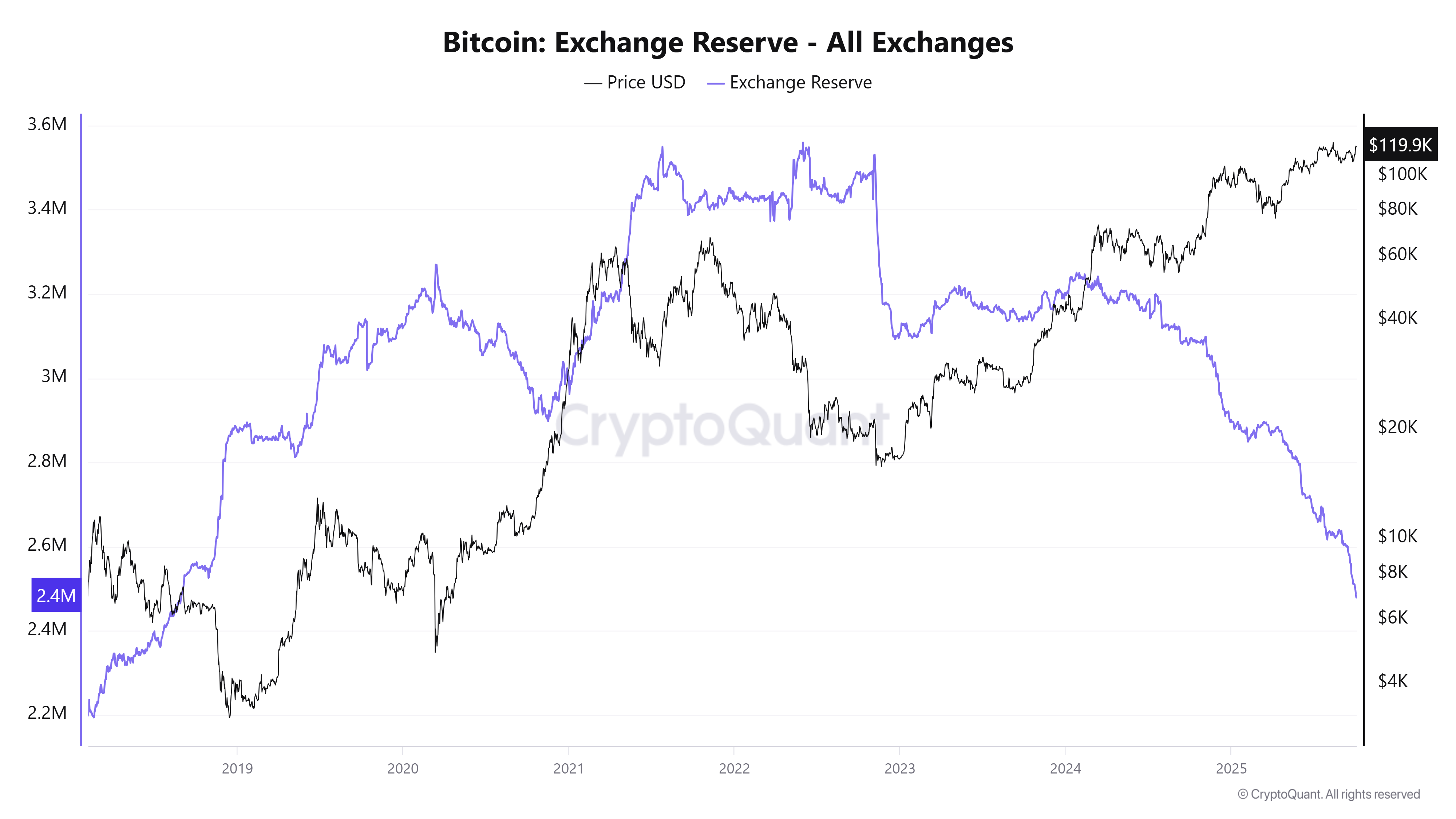 El gráfico de Reservas de Intercambio de Bitcoin de CryptoQuant - Todos los Intercambios a continuación muestra que la reserva ha caído a 2,4 millones esta semana, extendiendo su declive desde principios de septiembre.