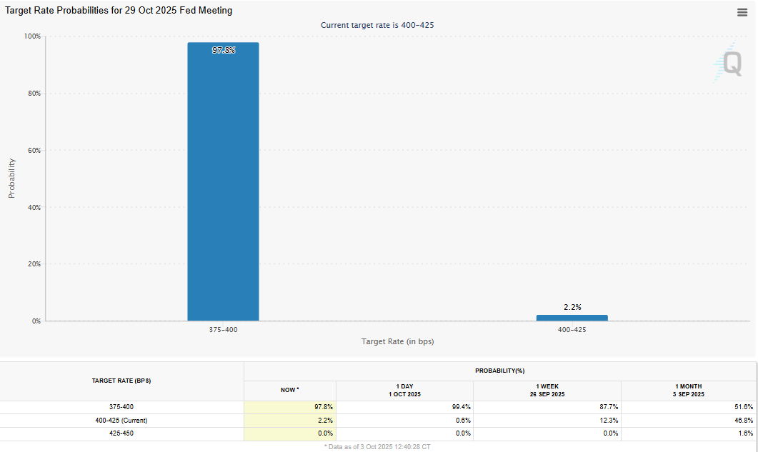 Según la herramienta FedWatch del CME Group, los operadores están valorando en más del 97% la posibilidad de que la Reserva Federal de EE.UU. reduzca los costos de endeudamiento en 25 puntos básicos el 29 de octubre.