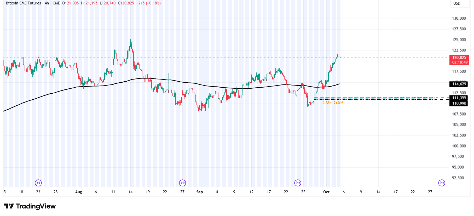 El gráfico de futuros de BTC CME (Chicago Mercantile Exchange) de 4 horas muestra un hueco entre 110.990$ y 111.355$ causado por el movimiento del Bitcoin durante el fin de semana. Históricamente, el mercado tiende a llenar estos huecos antes de reanudar su tendencia en curso.