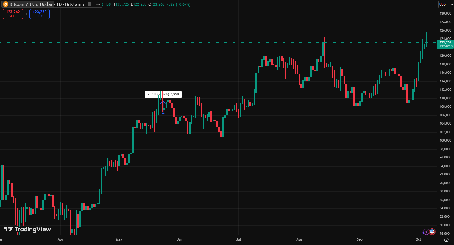 Tras una semana de incrementos sostenidos que rondan el 8%, BTC superó la marca de los USD 125.5559 y, ahora mismo, se negocia por el orden de los USD 123.357, según la Calculadora de Precios de CriptoNoticias.