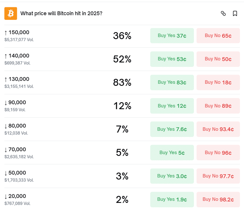 Pero los pronósticos optimistas no se quedan solo entre los grandes analistas. En las plataformas de predicción como Polymarket, el consenso también es fuertemente alcista respecto al precio objetivo de Bitcoin para este año. En una de las predicciones, el 81% de los apostadores está seguro de que la moneda alcanzará los $130.000.