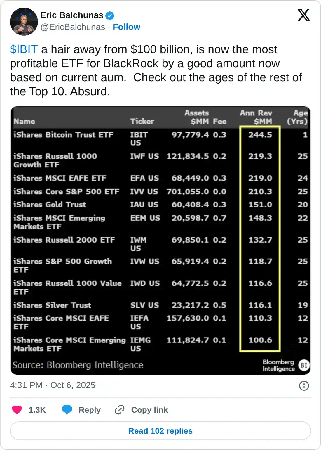 El iShares Bitcoin Trust (IBIT) ha emergido como el fondo más rentable de BlackRock, generando 245 millones de dólares en ingresos anuales, afirmó el analista de Bloomberg Eric Balchunas en una publicación en X el lunes. El producto superó al iShares Russell 1000 Growth ETF (IWF) de BlackRock y al iShares MSCI EAFE ETF (EFA) para alcanzar la cima de la lista.