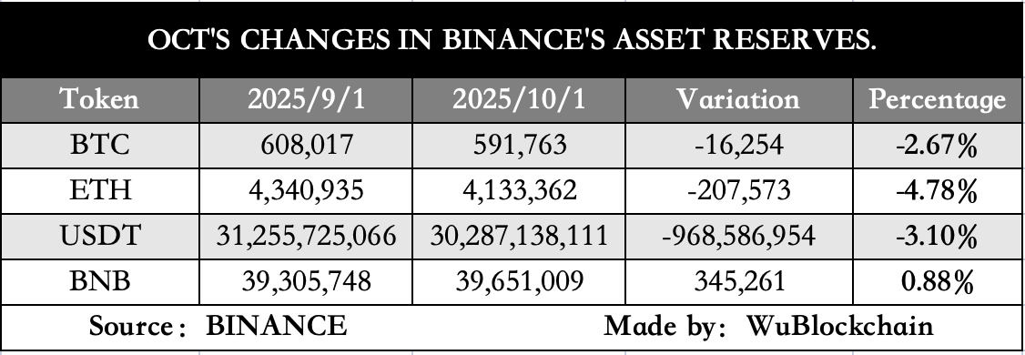 El reciente lanzamiento de Binance mostró una disminución del 2.67% en las tenencias de BTC de los usuarios respecto al mes anterior. Binance ahora tiene 591,000 BTC, una caída de 16,200 desde septiembre. Del mismo modo, las reservas de ETH cayeron un 4.78% a 4.13 millones, y los activos de USDT también disminuyeron un 3.1%. Estas criptomonedas se están moviendo principalmente a billeteras frías.