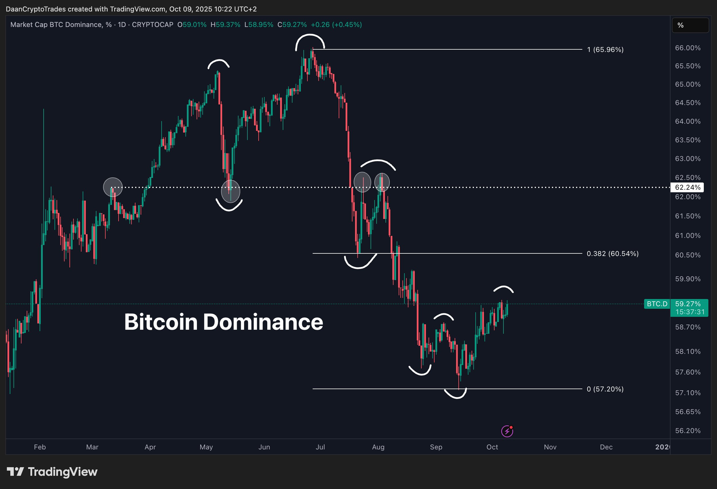 “Creo que este aumento podría alcanzar alrededor del 60% hasta que las altcoins alcancen nuevamente. Aún lo considero un rebote dentro de una caída mayor en el gráfico de Dominancia de Bitcoin.
