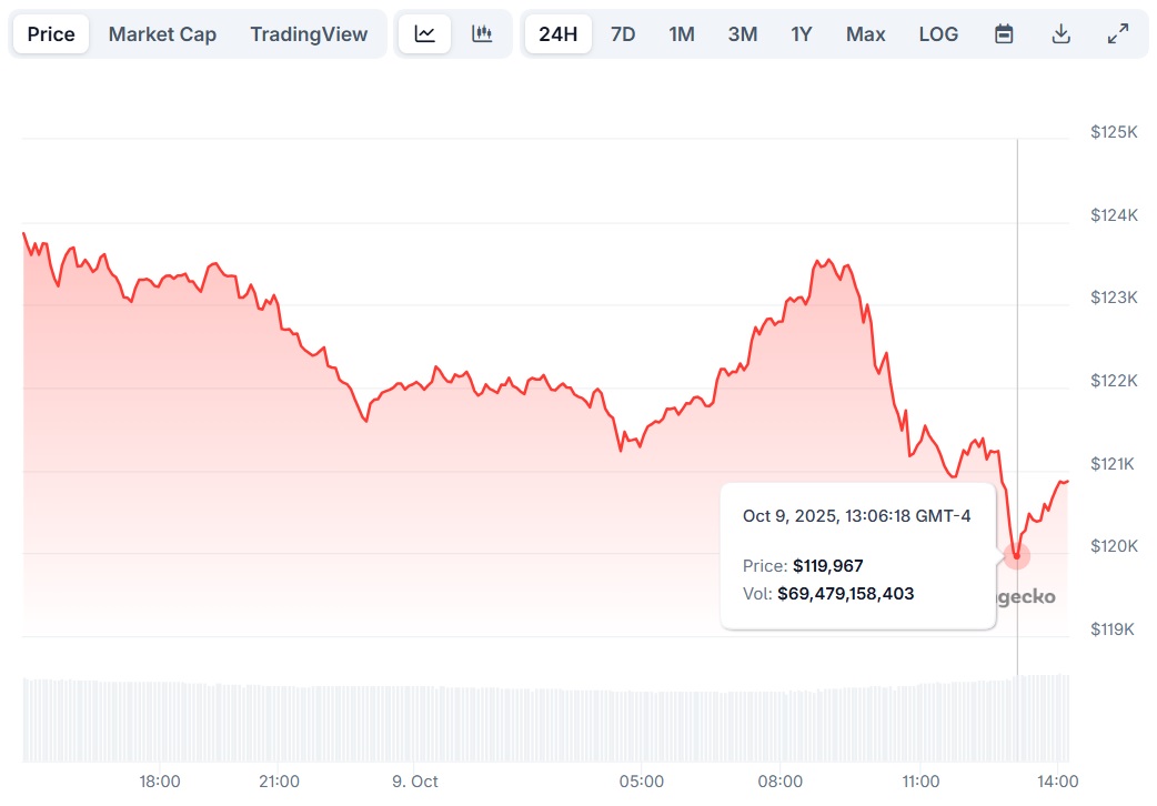 Bitcoin (BTC) retrocedió por debajo de los USD $121.000 este jueves, extendiendo la corrección por tercer día consecutivo después de haber roto un nuevo máximo histórico de precio por encima de los USD $126.000 el lunes.