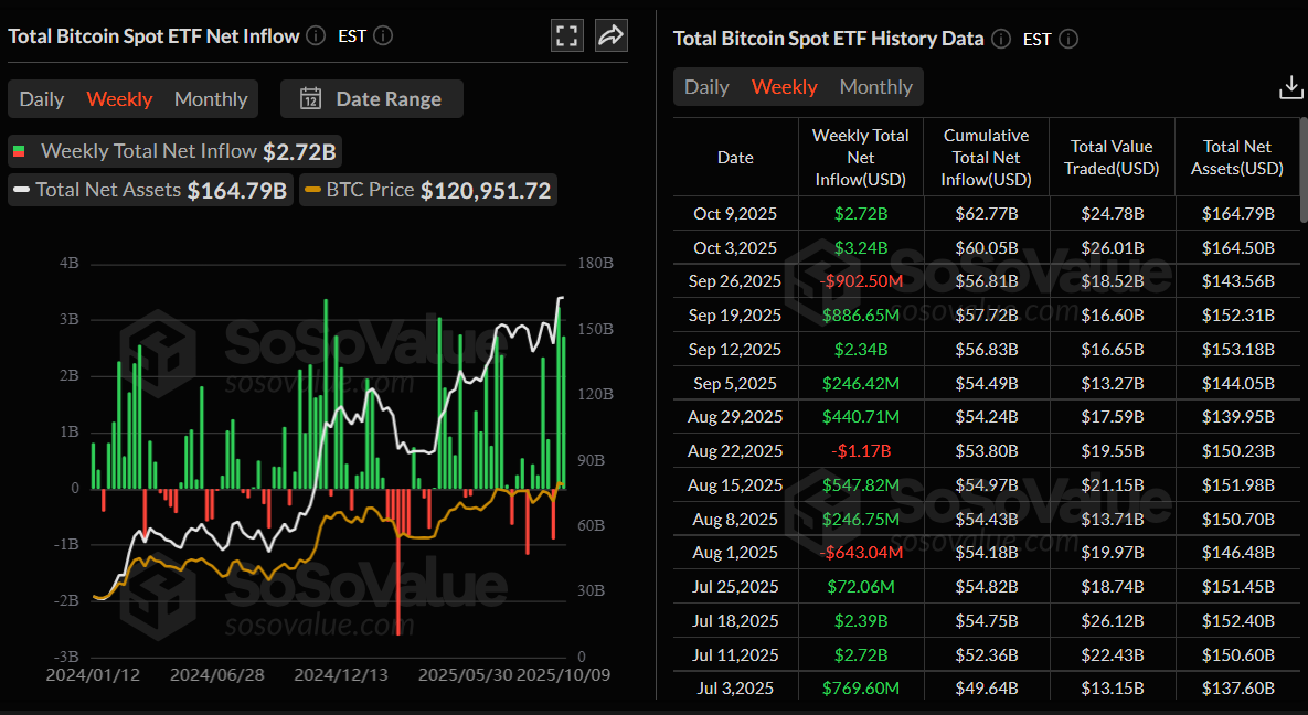 La demanda institucional de Bitcoin se mantuvo fuerte hasta esta semana. Según los datos de SoSoValue (gráfico a continuación), los ETFs de Bitcoin al contado registraron un total de 2.72 mil millones de dólares en entradas hasta el jueves. Esto marca la segunda semana consecutiva de flujo positivo, tras la mayor entrada en 2025 y la segunda más grande registrada en la semana anterior, lo que impulsó el precio del BTC a nuevos máximos.