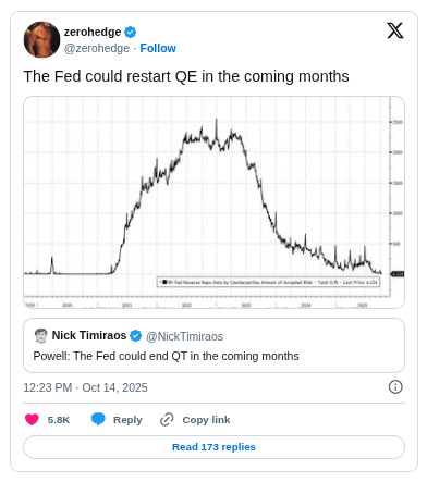 Durante su discurso en la conferencia de la National Association for Business Economics (NABE) el 14 de octubre de 2025, Powell reveló que la Fed está considerando terminar su programa de endurecimiento cuantitativo (QT).