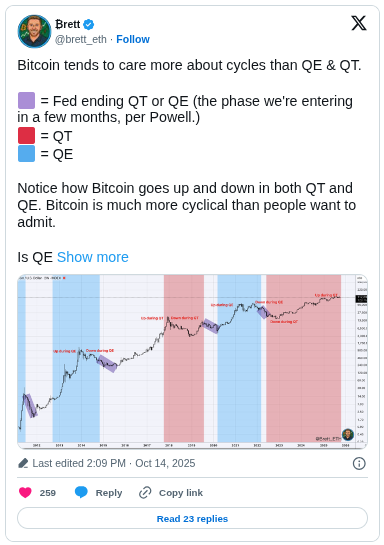 En cuanto a la reacción de Bitcoin, Brett cree que el activo tiende a moverse en ciclos en lugar de responder directamente a QE o QT. En su opinión, las tendencias a largo plazo de Bitcoin operan algo independientemente de la política monetaria.