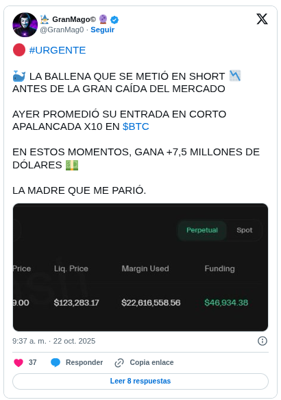 Una ballena de criptomonedas que ganó más de 197 millones de dólares durante el crash de octubre ha vuelto a los mercados, esta vez con una posición corta apalancada contra Bitcoin (BTC). El movimiento reaviva las tensiones entre bajistas y alcistas mientras el precio del activo intenta estabilizarse tras semanas de alta volatilidad.