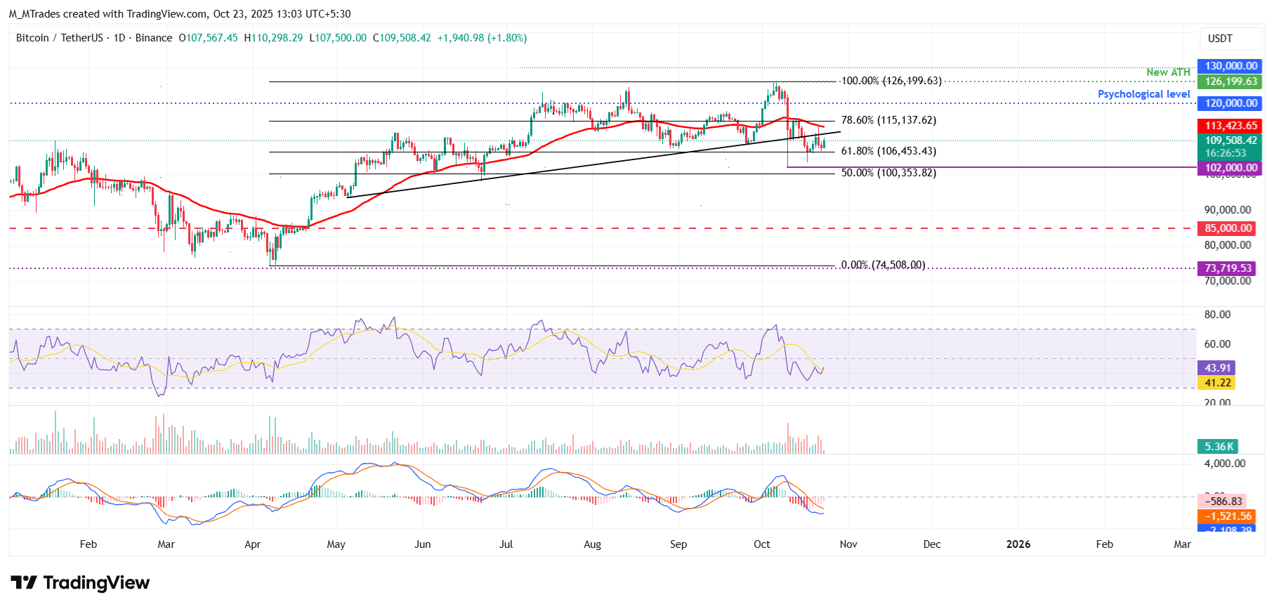 Por otro lado, si el BTC cierra por debajo del soporte de 106.453$, podría extender pérdidas adicionales hacia el mínimo del 10 de octubre de 102.000$.