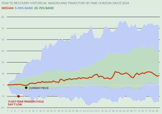 El informe analizó un conjunto de datos que cubre más de 40 eventos de miedo desde 2024, cada uno normalizado en una ventana de 84 días para capturar el ciclo completo de Miedo a Recuperación. La configuración de octubre refleja el template histórico casi a la perfección: una rápida corrección del -10%, una consolidación de 11 días y un sesgo estadístico hacia una recuperación del 15–30% en las siguientes 8–12 semanas. Mientras que el sentimiento a corto plazo sigue siendo cauteloso, los datos indican fuertemente que el miedo aún representa un reinicio, no una reversión.